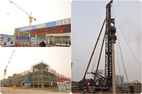 左上圖為北師大附校項目工地入口農(nóng)民工實名制通道,左下圖為東方機(jī)械電子廠房項目部分樓層封頂,右圖為未來科技城項目二期工程樁基施工。