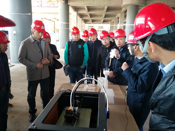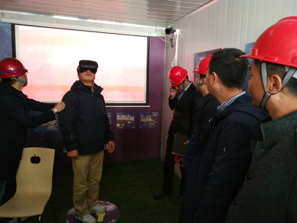 圖為觀摩人員參觀項(xiàng)目現(xiàn)場BIM技術(shù)運(yùn)用中的3D打印技術(shù)和現(xiàn)場危險(xiǎn)源VR展示場景。