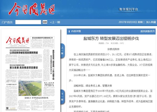 鹽城東方集團是國家級鹽城經(jīng)濟技術(shù)開發(fā)區(qū)于2003年7月出資1.5億元成立的全額獨資國有企業(yè),發(fā)展至2017年6月底,資產(chǎn)總額已達377.06億元、擁有50家全資及控(參)股子公司,因其資產(chǎn)負(fù)債率低、直接融資占比高、納稅能力強、轉(zhuǎn)型升級早,成為鹽城地區(qū)國企發(fā)展標(biāo)桿,在蘇北乃至全省、上海的相關(guān)地區(qū)也產(chǎn)生了一定的影響。