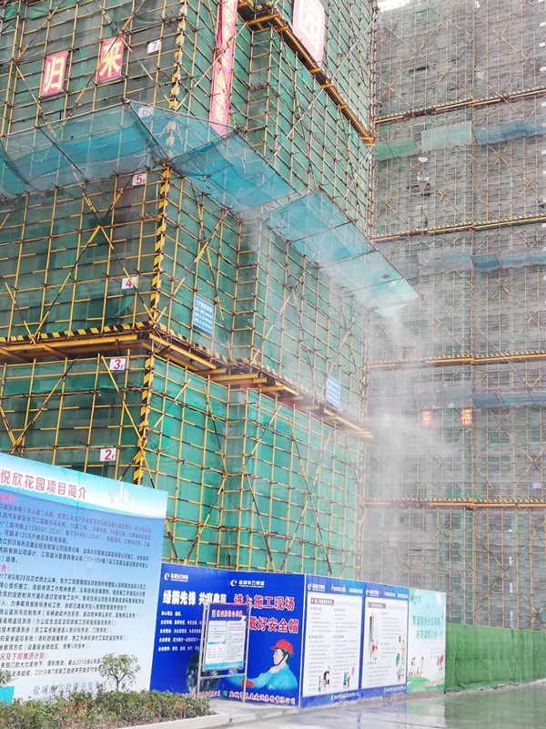 揚(yáng)塵是施工過程中的常見問題。在該工地內(nèi),環(huán)境監(jiān)測(cè)系統(tǒng)和高壓噴淋設(shè)備這兩件“神器”有效抑制了揚(yáng)塵污染?,F(xiàn)場(chǎng)看到,環(huán)境監(jiān)測(cè)系統(tǒng)隨時(shí)監(jiān)控PM2.5、PM10、噪聲、溫度等數(shù)值,工地的各建筑樓體在第四層腳手架外圍每隔3米安裝一個(gè)高壓噴淋設(shè)備,項(xiàng)目出入口處采用霧炮機(jī)進(jìn)行揚(yáng)塵控制,確保噴淋范圍能夠全覆蓋。當(dāng)揚(yáng)塵監(jiān)測(cè)系統(tǒng)濃度達(dá)到警戒值時(shí),高壓噴淋設(shè)備便會(huì)噴射出細(xì)密的水霧,霧炮機(jī)則針對(duì)不同施工區(qū)域適時(shí)調(diào)整方向,噴射高壓水霧,確保施工現(xiàn)場(chǎng)不起揚(yáng)塵。