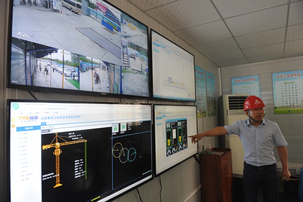 位于項(xiàng)目部會(huì)議室的“信息指揮中心”,正是智慧工地的“大腦”。墻壁上四塊電視屏幕顯示著工地內(nèi)實(shí)時(shí)視頻和各種數(shù)據(jù)。施工單位負(fù)責(zé)人介紹,通過工地內(nèi)分布的監(jiān)控?cái)z像頭和傳感器,所傳出的視頻和采集的數(shù)據(jù)全部集中到平臺(tái)展示,而這些控制點(diǎn)主要分布在作業(yè)層、塔吊、施工電梯等存在安全隱患的部位,便于對(duì)現(xiàn)場(chǎng)全方位、全天候監(jiān)督管理。