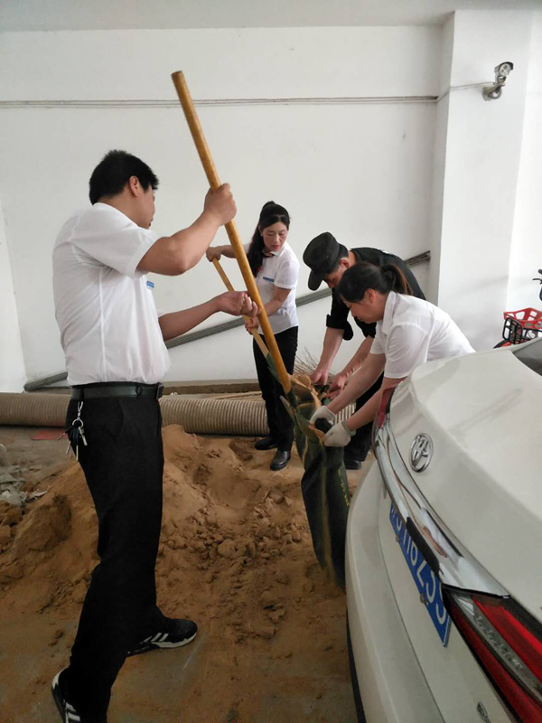 圖為東方物業(yè)工作人員準(zhǔn)備防汛沙袋