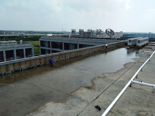 圖為東方物業(yè)人員清理屋頂積水,疏通排水管