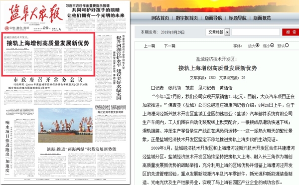 《鹽阜大眾報(bào)》頭條推出“鹽城經(jīng)濟(jì)技術(shù)開(kāi)發(fā)區(qū):接軌上海增創(chuàng)高質(zhì)量發(fā)展新優(yōu)勢(shì)”http://yfdzb.ycnews.cn/yfdz/20180829/html/index_content_000.htm(《鹽阜大眾報(bào)》電子版)——