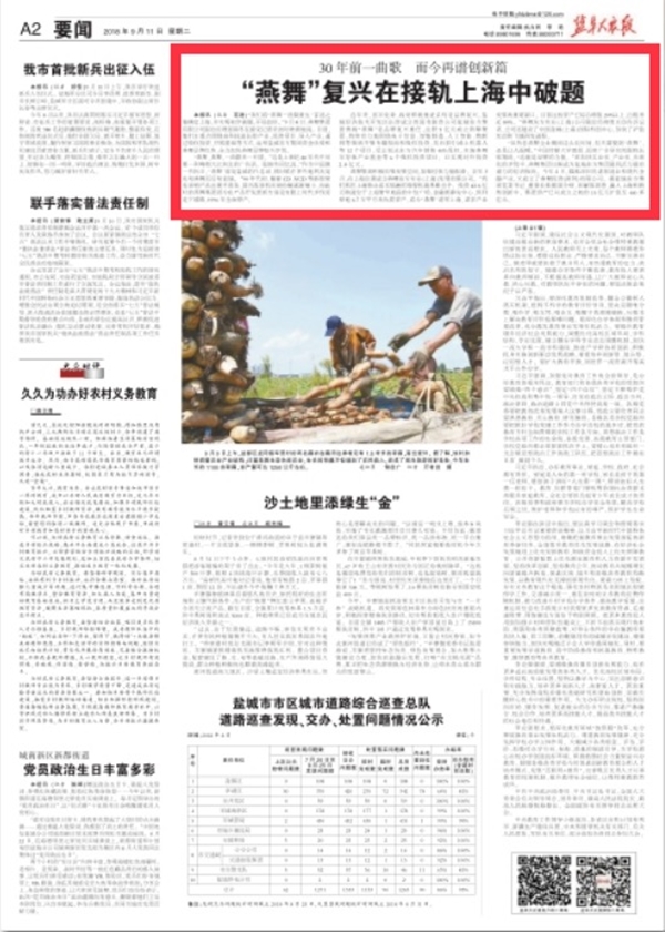 《鹽阜大眾報(bào)》今日二版頭條推出“30年前一曲歌 而今再譜創(chuàng)新篇——'燕舞'復(fù)興在接軌上海中破題” http://yfdzb.ycnews.cn/yfdz/20180911/html/page_01_content_003.htm(《鹽阜大眾報(bào)》電子版)——