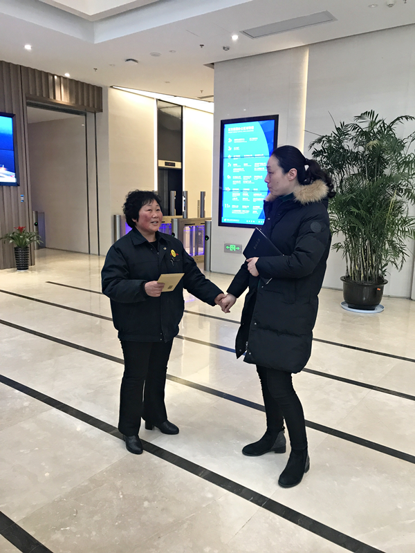 丁嵐詳細(xì)詢問了王秀紅的工作和生活情況。王秀紅在東方物業(yè)從事保潔工作,七年多來,她勤勤懇懇、領(lǐng)悟性高,不怕苦、不怕累,具有很強的集團(tuán)榮譽感。在技能比賽前,虛心請教保潔主管,反復(fù)訓(xùn)練,在比賽中與團(tuán)隊合作,多次取得好成績。在家庭生活中,她和丈夫承擔(dān)著贍養(yǎng)三位老人、帶著一個年幼孩子的責(zé)任。兩年前,她的婆婆檢查出肺癌,患病期間由她精心照料,婆婆已于2017年去世,作為兒媳婦的她盡了最大的孝心。現(xiàn)在,家里的三位老人最大的已89歲,其中她的母親是聾啞人,生活自理都很困難,為了提高他們的生活質(zhì)量,王秀紅夫妻倆共同擬定了生活規(guī)劃,精心照料老人起居,用心陪伴老人。王秀紅家里還有兩個女兒,大女兒已出嫁,小女兒在上小學(xué),她也經(jīng)常教育孩子學(xué)會尊重老人。丁嵐對她勤懇工作、愛崗敬業(yè)、無私奉獻(xiàn)的精神表示贊賞和敬佩,希望她再接再厲,更好地為弘揚新時代文明新風(fēng)、推動文明進(jìn)步作出新的貢獻(xiàn)。