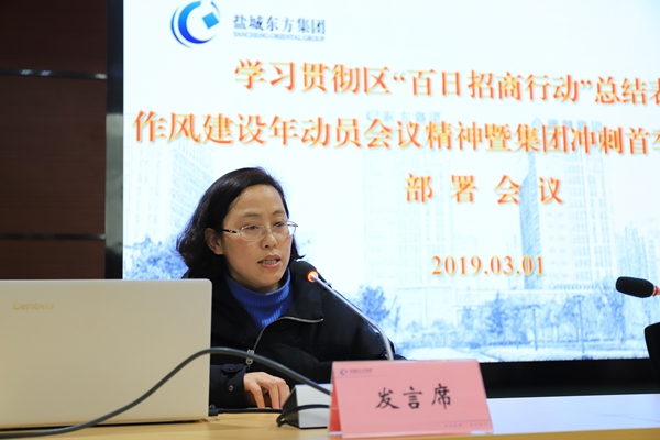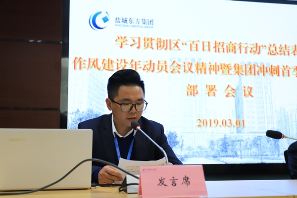 3月1日,鹽城東方集團召開學習貫徹區(qū)“百日招商行動”總結(jié)表彰、作風建設年動員大會精神暨集團沖刺首季“開門紅”部署會議。集團黨委書記、董事長張振國傳達學習區(qū)“百日招商行動”總結(jié)表彰會議精神,全面部署2019年重點工作,號召和動員集團上下大干當前、力奪首季開門紅,推動集團高質(zhì)量發(fā)展走在蘇北蘇中同類國企前列。集團副黨委書記、副董事長、總經(jīng)理王旭東主持會議。集團領導班子全體成員,各部門、子公司中層以上人員參會。