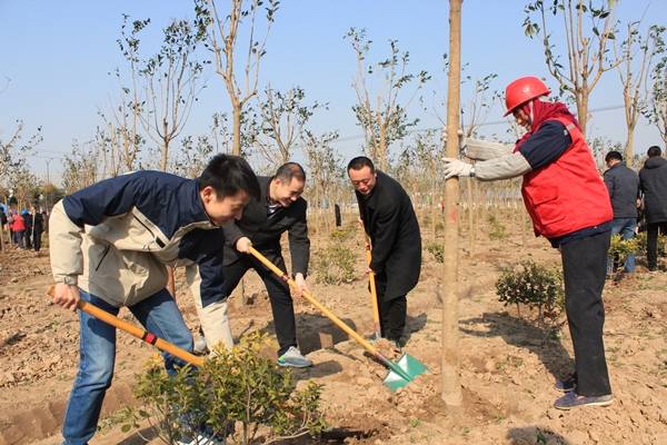 在植樹現(xiàn)場,志愿者們拿著鐵鍬投入到火熱的植樹活動中,揮锨挖坑,熟練地松土,小心翼翼地種植樹苗。大家四五人一隊,分工合作,密切配合,一人扶正樹苗,其余揮鍬培土,一邊勞作,一邊談?wù)摌淠酒贩N、土壤墑情、科學(xué)管護。勞動現(xiàn)場,志愿者們熱情高漲,有汗顧不得擦,揮鍬干勁十足。在大家的共同辛勤勞動下,沒過一個小時,一棵棵新栽植的女貞苗木昂然挺立,錯落有致,在和煦的春風(fēng)中傳遞著春的生機與活力。