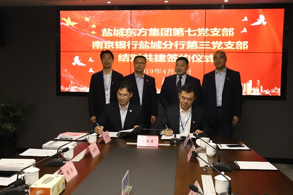 隨后,鹽城東方集團第七黨支部書記孫為軍與南京銀行鹽城分行第三黨支部書記嚴安簽訂了黨建共建協(xié)議書。