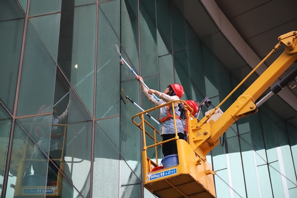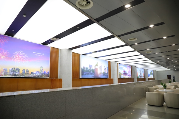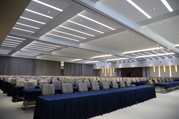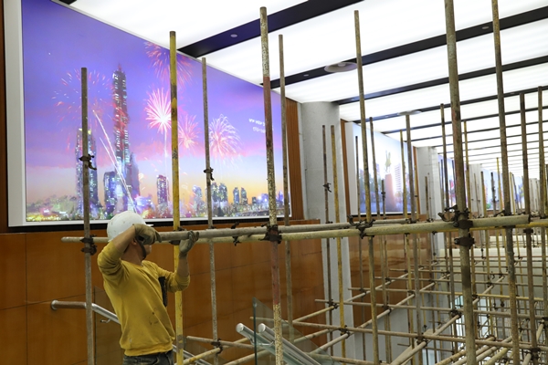 場(chǎng)館提升改造過(guò)程中,項(xiàng)目管理人員與現(xiàn)場(chǎng)50多名工人日夜忙碌、并肩作戰(zhàn),開足馬力推進(jìn)會(huì)議中心燈光亮化和LED顯示屏安裝工程。一手搶抓工期,科學(xué)制定施工方案,對(duì)施工單位明確獎(jiǎng)懲條款,在充分利用時(shí)間的同時(shí)合理套搭施工,提高施工效率;一手與施工單位簽訂安全生產(chǎn)責(zé)任狀,定時(shí)定點(diǎn)巡查安全質(zhì)量隱患,確保安全“零事故”和質(zhì)量“高品質(zhì)”。截止目前,項(xiàng)目現(xiàn)場(chǎng)安裝完成3塊LED顯示屏,二樓會(huì)議大廳頂部噴淋改造,舞臺(tái)燈具槽、吊頂及會(huì)場(chǎng)燈具安裝均已完成,中心休息區(qū)及貴賓室升級(jí)等工程已順利完工。為做好全館保潔、室外的環(huán)境衛(wèi)生等工作,東方物業(yè)自4月30日接到通知后,即刻行動(dòng),清洗噴泉池及室外廣場(chǎng),修理噴水泵及廣場(chǎng)石材等,并配合做好改造后的全館保潔、零星維修、現(xiàn)場(chǎng)安保、音響及大屏調(diào)試等工作。