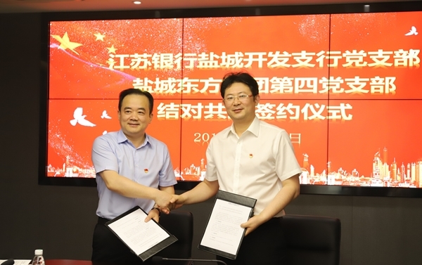 簽約儀式上,鹽城東方集團第四黨支部書記王成林與江蘇銀行鹽城開發(fā)支行黨支部書記史雪峰共同簽訂了黨建共建協(xié)議書。