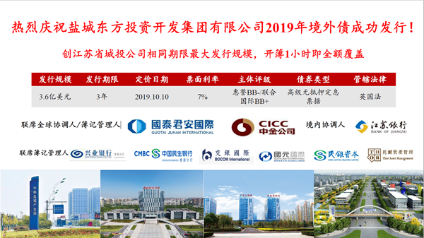 準(zhǔn)確研判形勢,搶抓市場機(jī)遇,最終在香港成功發(fā)行3年期4億美元境外債券,創(chuàng)江蘇省同類型、同期限最大發(fā)行規(guī)模,充分彰顯和堅定了金融機(jī)構(gòu)和投資人對鹽城東方集團(tuán)的投資信心。