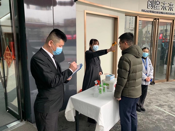 2月10日,是上海市市政府發(fā)布通知的節(jié)后企業(yè)復(fù)工首日。為營造安全的辦公環(huán)境,金融街(靜安)中心加強對復(fù)工企業(yè)人員的進出管控,使用一米欄將大堂入口隔離排隊區(qū)域,隔離登記區(qū)域并放置登記及體溫測量工具,在現(xiàn)場保安及客服人員的指引下,員工體溫測量及登記工作有序進行。對所管轄的項目的電梯轎廂里放置了一次性餐巾紙供使用電梯的業(yè)戶使用,避免間接性接觸,對全樓層進行全面消殺,全力守護復(fù)工人員的生命安全和健康。