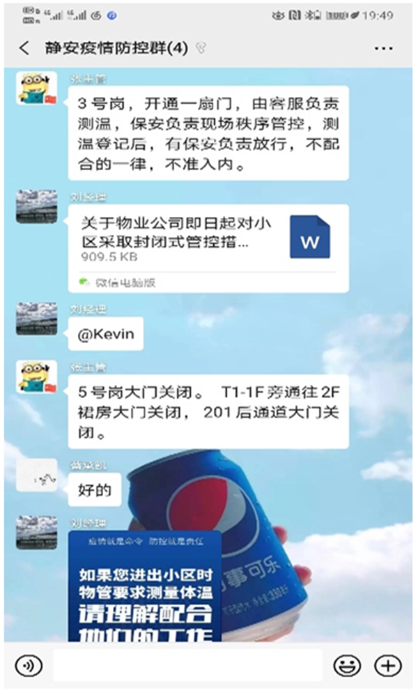 “緊跟權(quán)威信息、科學籌備、聯(lián)防聯(lián)控”是上級對本項目此次疫情工作的指示要求。為了確保信息傳達的及時性,除了要求各部門手機保持24小時暢通外,金融街(靜安)中心項目針對此次疫情建立“靜安疫情防控群”微信群,保持實時溝通及傳達,并與曹家渡街道辦、曹家渡疫情防控小組、房管局等政府部門人員保持實時溝通。先后落實了“曹家渡街道關(guān)于樓宇疫情防控工作要求” “靜安區(qū)復(fù)工企業(yè)申請” “房管局物業(yè)小區(qū)防疫自查” “企業(yè)在滬/回滬人員信息情況”等重點工作統(tǒng)計及落實;為強化項目管控措施,金融街物業(yè)管理處擬訂并落實實施《金融街(靜安)中心即日起試試封閉式管理方案》。此方案的執(zhí)行使疫情的防控措施得到完善,為疫情的防控增加了一層保障。
