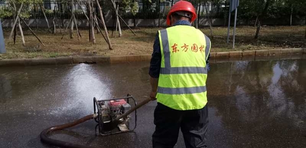 6月29日凌晨5點,東方園林出動皮卡工程車5輛,汽油抽水泵4臺,挖機一臺。5人負(fù)責(zé)招商中心抽水排澇,23人赴鹽瀆路抽水排澇保障當(dāng)日活動,各路段84人巡查扶樹,扶樹共計137棵。