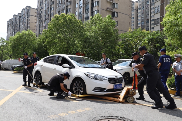 為了在緊急時(shí)刻快速疏通消防車通道,打通消防救援的“最后一公里”。 康欣花園項(xiàng)目部配置了2臺(tái)輕便實(shí)用的挪車器。該挪車器由四個(gè)相同的部件組成,底部采用萬向輪。只見4名保安人員利用液壓設(shè)備抬升汽車的四個(gè)輪胎,合力推動(dòng)挪車器,便可快速移走占道車輛,為消防車清除障礙。