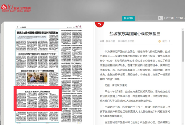 近日,《新華日報(bào)》第8版“一線視點(diǎn)”刊發(fā)《鹽城東方集團(tuán)同心戰(zhàn)“疫”展擔(dān)當(dāng)》,《交匯點(diǎn)》新聞客戶端、《中國江蘇網(wǎng)》、《新華鹽城觀察》公眾號(hào)同期轉(zhuǎn)發(fā),關(guān)注報(bào)道鹽城東方集團(tuán)堅(jiān)持以統(tǒng)籌全局的思路集中力量戰(zhàn)疫情,主動(dòng)勇挑重?fù)?dān)、迎難而戰(zhàn),以實(shí)際行動(dòng)當(dāng)好疫情防控的“勤務(wù)員”,展現(xiàn)出國有企業(yè)特殊時(shí)期的使命擔(dān)當(dāng)。