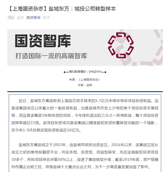 對此,鹽城東方成功“出圈”,在省內(nèi)外乃至長三角主流媒體圈激起陣陣漣漪。近日,繼《新華日報》發(fā)表“鹽城東方集團:股權(quán)投資結(jié)碩果 轉(zhuǎn)型升級勢頭勁”,《鹽阜大眾報》整版報道“鹽城東方集團:深度接軌上海 打造轉(zhuǎn)型樣板”后,12月15日,《上海國資》雜志以“鹽城東方:城投公司轉(zhuǎn)型樣本”為題,深度報道東方集團如何以敢闖敢干的勇氣和自我革新的擔(dān)當(dāng),實現(xiàn)精準(zhǔn)的股權(quán)投資,開放的管理體系,描繪高質(zhì)量東方發(fā)展新圖景。“國資智庫”公眾號同期轉(zhuǎn)載。