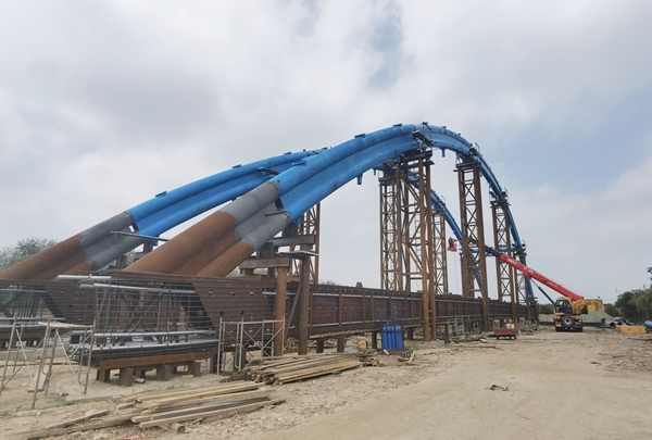 德喜大橋項(xiàng)目部以使命必達(dá)的決心,全力以赴加快項(xiàng)目建設(shè),加派施工人員多作業(yè)面同步推進(jìn),采用優(yōu)化工序、穿插作業(yè),實(shí)行兩班倒24小時(shí)施工,確保工程質(zhì)量及施工安全,全力加快建設(shè)速度。截至目前,該項(xiàng)目已完成橋梁全部下部結(jié)構(gòu)、接線底層瀝青攤鋪、主橋上部鋼結(jié)構(gòu)拼裝、河西預(yù)制板梁吊裝。當(dāng)前正在進(jìn)行河?xùn)|現(xiàn)澆箱梁第八聯(lián)支架搭設(shè)、主橋上部結(jié)構(gòu)、河西預(yù)制板梁護(hù)欄施工。