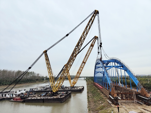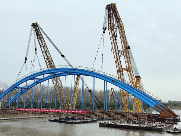 10月20日13時20分,在鹽城經開區(qū)德喜大橋施工現場,跨徑97米、重480噸的勁性骨架系桿拱在兩艘大型浮吊船的聯合起吊下,平穩(wěn)安裝至主墩位置,完成主橋上部結構整體吊裝,標志著德喜大橋順利完成合龍,項目施工進入新的階段。