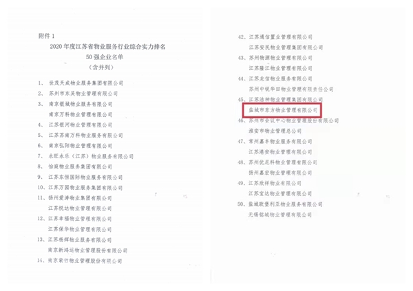 日前,江蘇省房地產(chǎn)業(yè)協(xié)會(huì)發(fā)布“2020年度江蘇省物業(yè)服務(wù)行業(yè)綜合實(shí)力50強(qiáng)企業(yè)排名”名單,鹽城市東方物業(yè)管理有限公司榜上有名。