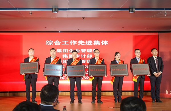 集團(tuán)黨委書記、董事長(zhǎng)、總經(jīng)理王旭東為綜合工作先進(jìn)集體頒獎(jiǎng)。