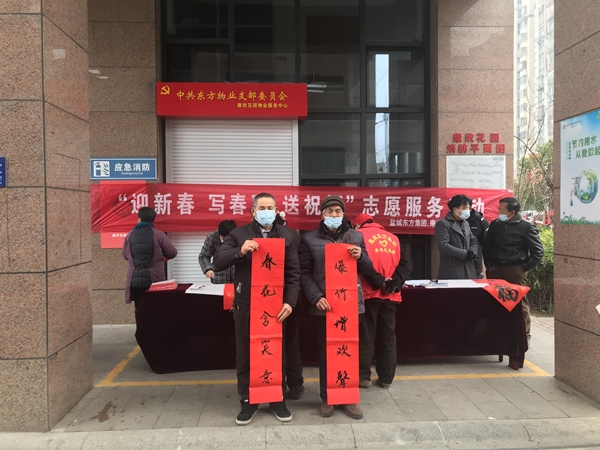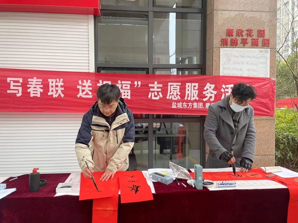 春節(jié)臨近,為弘揚傳統(tǒng)文化,豐富群眾的文化生活,進(jìn)一步將“我為群眾辦實事”落到實處,1月26日,鹽城東方集團(tuán)聯(lián)合康欣社區(qū)、華夏銀行,組織書法愛好者,走進(jìn)鹽城經(jīng)開區(qū)康欣花園,開展 “迎新春 寫春聯(lián) 送祝福“志愿服務(wù)活動,為居民們送去新春祝福。