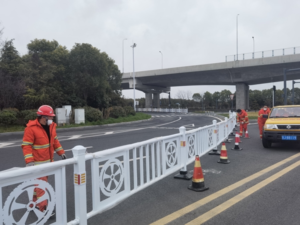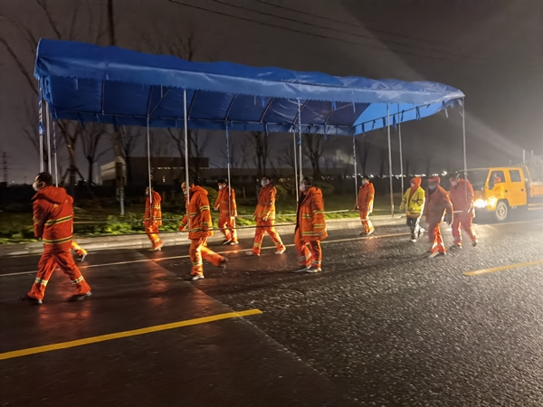 “護欄設置組抓緊到崗到位,立即封閉道路分流車輛;施工保障組趕快調撥功能用房并快速安裝,保障通水通電;登高作業(yè)組趕緊全員作業(yè),保證監(jiān)控設備應裝盡裝……”東方安通公司市政設施維護處負責人張輝在漓江路現(xiàn)場統(tǒng)籌調度,30余名施工人員和10多臺工程車輛馬力全開,在凜冽寒風和雨水中,構成了一幅熱火朝天的搶工會戰(zhàn)圖。