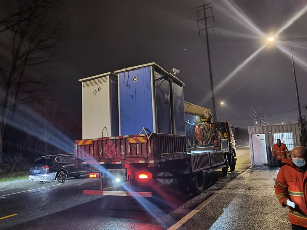 18日夜,東方安通公司身著“熒光橙”和“紅馬甲”的施工隊伍到達施工點位后分組突擊、統(tǒng)籌推進,挑燈作戰(zhàn)設置隔離護欄實現(xiàn)封閉管理,布置5間帶空調的功能用房并接水接電,同步完成4座獨立衛(wèi)生間和內部監(jiān)控系統(tǒng)。