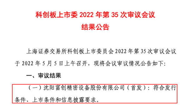 5月5日,上海證券交易所科創(chuàng)板上市委員會(huì)2022年第35次審議會(huì)議結(jié)果公告顯示,鹽城東方集團(tuán)參投的沈陽富創(chuàng)精密設(shè)備股份有限公司(以下簡(jiǎn)稱“富創(chuàng)精密”)的科創(chuàng)板首發(fā)申請(qǐng)獲通過。