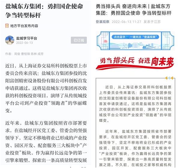 近日,從上海證券交易所科創(chuàng)板股票上市委員會傳來喜訊:鹽城東方集團參投的沈陽富創(chuàng)精密設(shè)備股份有限公司科創(chuàng)板首發(fā)申請獲通過。這將是鹽城東方集團再次收獲的科創(chuàng)板投資項目,演繹了從傳統(tǒng)城投平臺公司到產(chǎn)業(yè)投資“領(lǐng)跑者”的華麗蝶變。