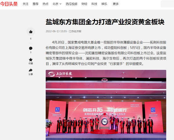 4月20日,國家集成電路大基金唯一控股的半導(dǎo)體薄膜設(shè)備企業(yè)——拓荊科技股份有限公司在上海證券交易所鳴鑼上市,成功登陸科創(chuàng)板;5月5日,國內(nèi)半導(dǎo)體設(shè)備精密零部件的領(lǐng)軍企業(yè)——沈陽富創(chuàng)精密設(shè)備股份有限公司科創(chuàng)板上市過會,這將是鹽城東方集團繼中微半導(dǎo)體、瀾起科技、海爾生物后,再次收獲的兩個科創(chuàng)板投資項目,演繹了從傳統(tǒng)城投平臺公司到產(chǎn)業(yè)投資“行家里手”的華麗蝶變。