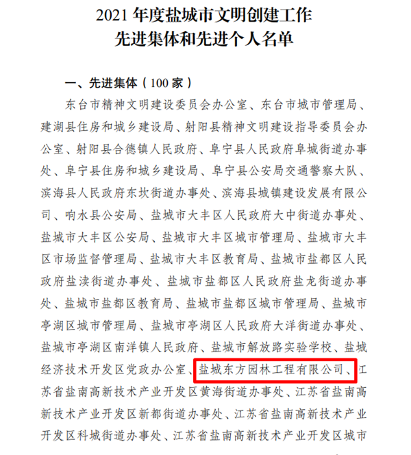“水清、岸綠、景美,生活在這里,幸福感滿滿”“家門口就有散步休閑的去處,太方便了”……夏日清晨,東郊迎賓公園里晨練的市民連連感嘆。近年來(lái),鹽城東方園林有限公司聚焦人民群眾需求,下大力氣推進(jìn)基礎(chǔ)設(shè)施建設(shè),持續(xù)完善城市功能,潛心提升城市品位,讓幸福感在“家門口”落地生根……城市發(fā)展的每一個(gè)細(xì)微變化,都回響著鹽城東方園林人逐夢(mèng)前行的鏗鏘足音。日前,鹽城市委、市政府發(fā)布表彰決定,鹽城東方園林有限公司(以下簡(jiǎn)稱“東方園林”)獲評(píng)“2021年度鹽城市文明創(chuàng)建工作先進(jìn)集體”稱號(hào)。