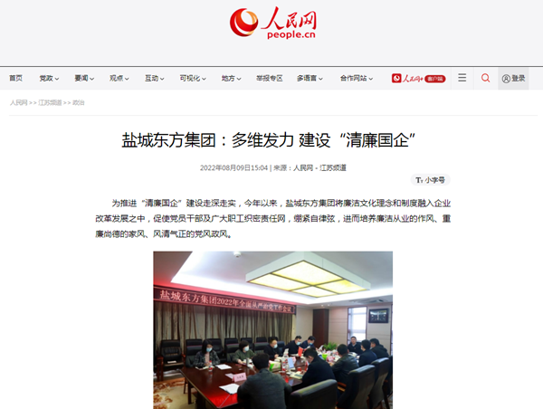 8月9日,《人民網(wǎng)》發(fā)表“鹽城東方集團:多維發(fā)力 建設(shè)‘清廉國企’”文章,聚焦鹽城東方集團縱深推進清廉國企建設(shè),不斷擦亮國企高質(zhì)量發(fā)展清廉底色的生動實踐。