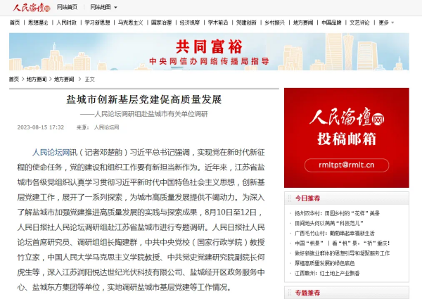 8月10日至12日,人民日報(bào)社人民論壇調(diào)研組赴鹽城市進(jìn)行專題調(diào)研,深入了解我市加強(qiáng)黨建推進(jìn)高質(zhì)量發(fā)展的實(shí)踐與探索成果。8月15日,人民日報(bào)社人民論壇網(wǎng)以《鹽城市創(chuàng)新基層黨建促高質(zhì)量發(fā)展》為題,宣傳我市有關(guān)單位黨建優(yōu)秀經(jīng)驗(yàn)做法,其中對鹽城東方集團(tuán)高質(zhì)量黨建引領(lǐng)高質(zhì)量發(fā)展的生動實(shí)踐給予充分褒揚(yáng)。