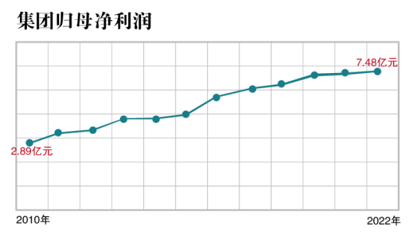 集團歸母凈利潤從2010年組建集團時的2.89億元,增長到2022年的7.48億元、增長了約1.59倍,且連續(xù)3年超7億元。