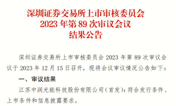 今天,深圳證券交易所創(chuàng)業(yè)板上市委員會(huì)發(fā)布公告:江蘇中潤(rùn)光能科技股份有限公司(以下簡(jiǎn)稱(chēng)“中潤(rùn)光能”)的首次公開(kāi)發(fā)行股票申請(qǐng)符合發(fā)行條件、上市條件和信息披露要求。