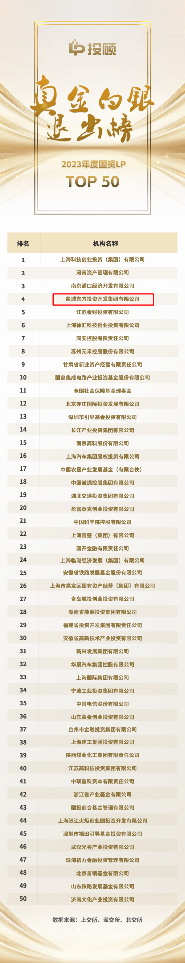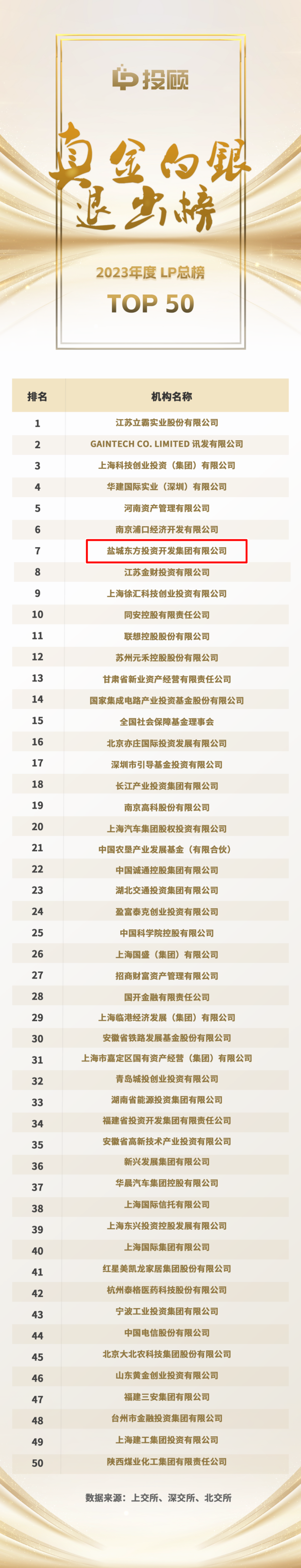 鹽城東方集團位列“2023年度國資LP TOP50”第4位,比2022年上升13位次,成為鹽城唯一一家連續(xù)三年入圍該榜單的國企;位列“2023年度LP總榜TOP50”第7位,比2022年上升19位次,成為連續(xù)兩年上榜、鹽城首家躋身該榜單的企業(yè)。