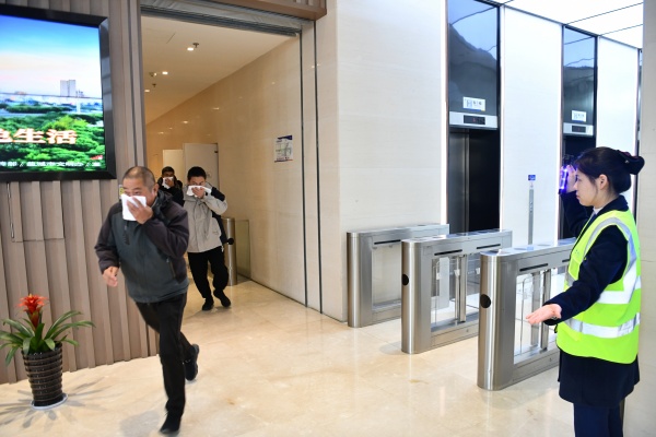 隨著大樓內(nèi)消防警鈴和廣播聲的響起,集團各樓層人員在現(xiàn)場疏散人員的指揮下,沿電梯廳前室處疏散樓梯撤離到室外廣場集中,由各部門負責人清點人員并上報總指揮。