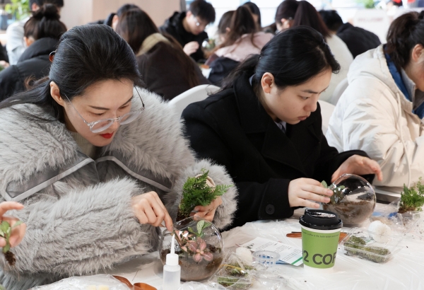 微景觀盆栽DIY成為本次活動(dòng)最受追捧的環(huán)節(jié)。青年們把該活動(dòng)作為傳遞綠色環(huán)保理念的獨(dú)特載體,充分發(fā)揮自己的創(chuàng)意和想象力,踏上了綠色環(huán)保藝術(shù)的奇幻之旅。他們將多肉植物、苔蘚與多種回收材料巧妙結(jié)合,成功打造出40多個(gè)生機(jī)盎然的“微型生態(tài)圈”,以藝術(shù)形式完美詮釋了環(huán)保智慧。