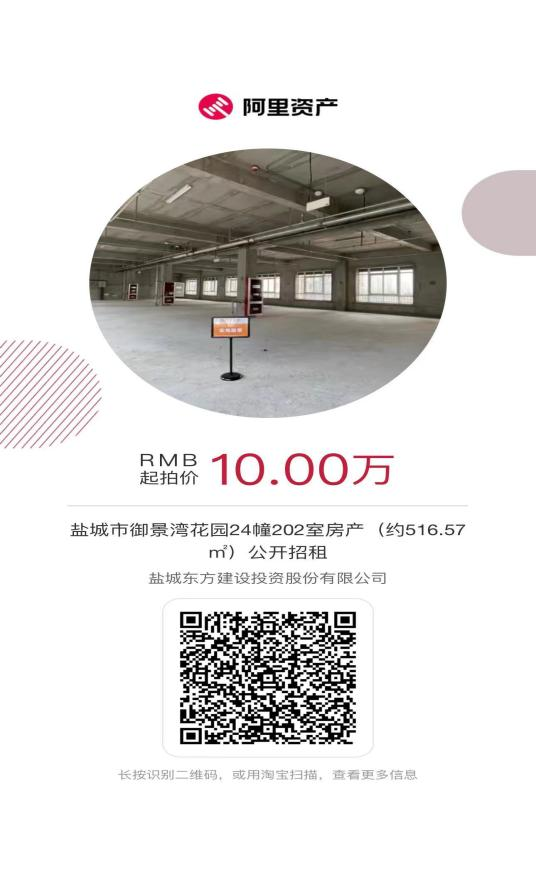 鹽城東方建設(shè)投資股份有限公司將于2024年5月4日10時(shí)起至2024年5月5日10時(shí)止(延時(shí)的除外),在阿里拍賣平臺(tái)對(duì)御景灣花園24#202室(商業(yè))進(jìn)行公開招租,建筑面積516.57平方米,按現(xiàn)狀招租,免租期2個(gè)月,租賃底價(jià):10萬元/年。加價(jià)幅度:2000元整或整倍數(shù),租賃期限為五年。