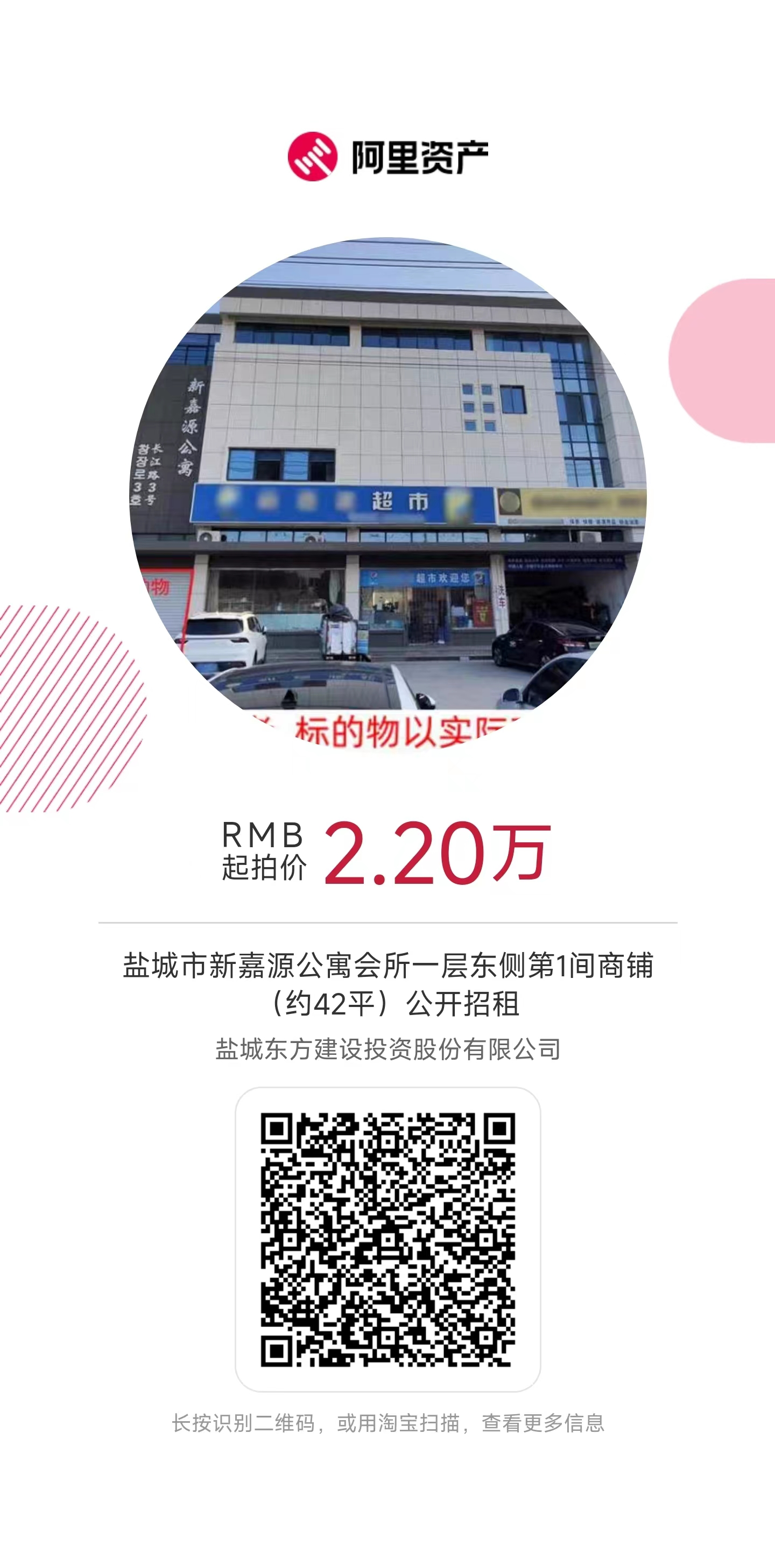 鹽城東方新天地置業(yè)有限公司將于2024年1月12日10時(shí)起至2024年1月13日10時(shí)止(延時(shí)除外),在阿里拍賣(mài)平臺(tái)對(duì)鹽城經(jīng)濟(jì)技術(shù)開(kāi)發(fā)區(qū)長(zhǎng)江路3號(hào)新嘉源公寓會(huì)所一層?xùn)|側(cè)第1間商鋪(約42平)公開(kāi)招租,免租期2個(gè)月,租賃起拍價(jià):22000元/年。上述房產(chǎn)加價(jià)幅度:500元整或整倍數(shù),租賃期限3年。